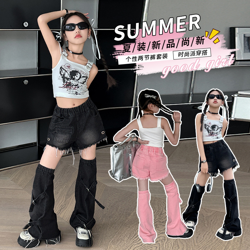 بدلة جينز بناتي صيفية رائعة 2024 موضة جديدة لرقص الجاز للأطفال في الشوارع للرقص من قسمين