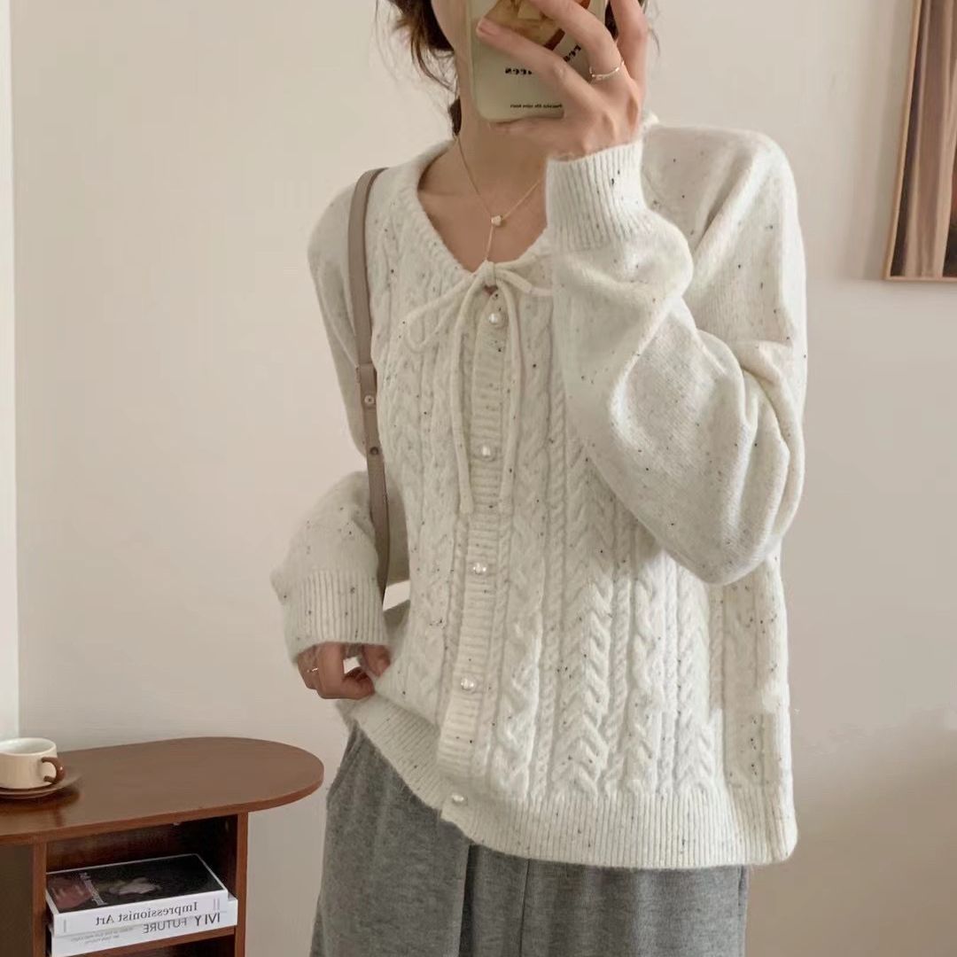 سترة نسائية محبوكة على الطراز الكوري لطيفة للخريف بتصميم جديد برباط ورقبة دائرية ومعطف علوي