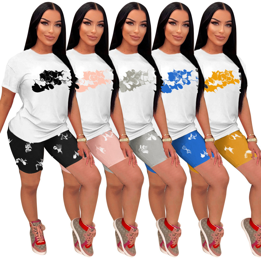 Y71333 تشيوانتشو الملابس النسائية الأوروبية والأمريكية بالجملة الربيع والصيف الترفيه أزياء الطباعة خمسة ألوان خمسة حجم مجموعة السراويل القصيرة الأكمام