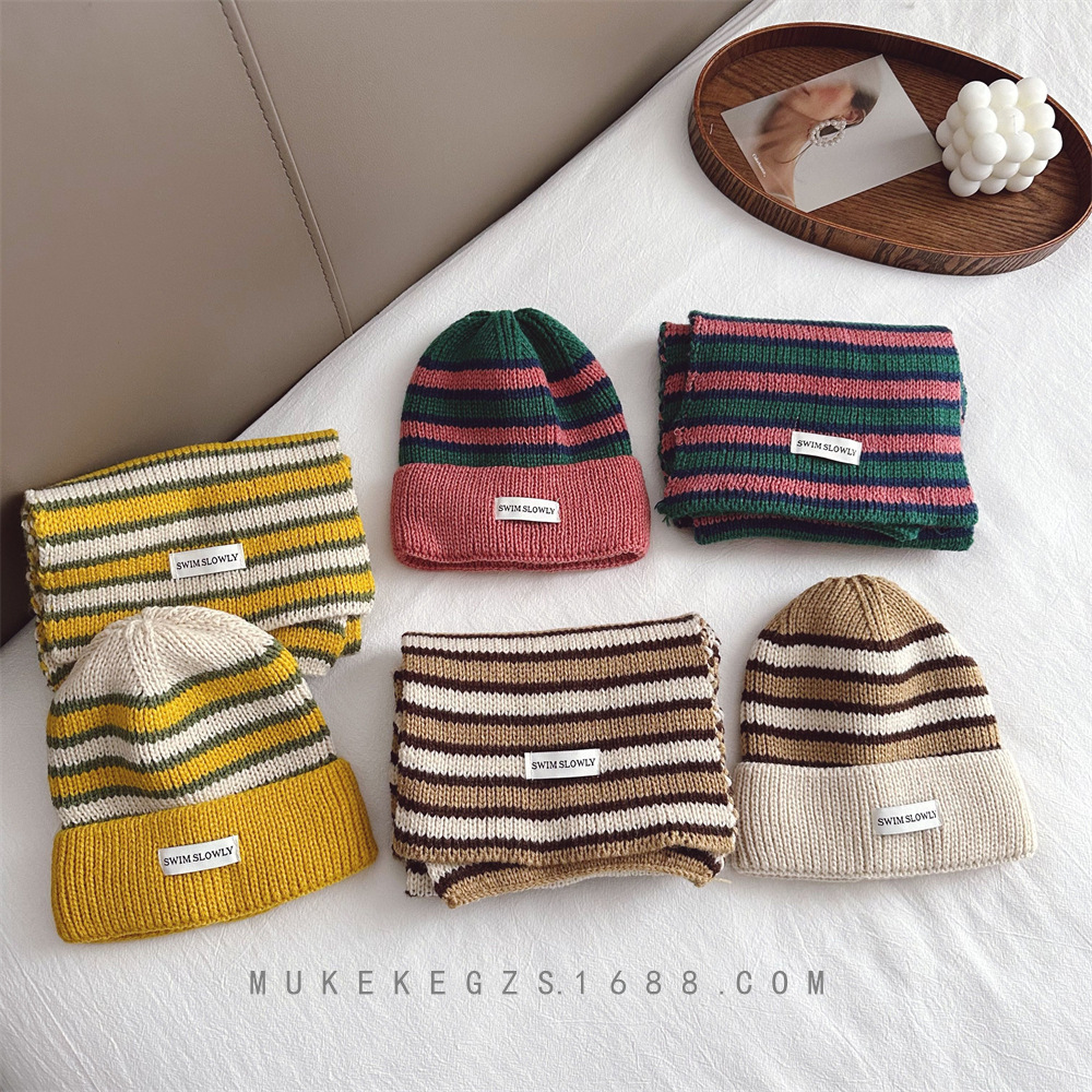 قبعة وشاح للأطفال مصممة من قطعتين مخططة على الطراز الغربي للأولاد والبنات بدلة وشاح قبعة محبوكة مبطنة بالصوف