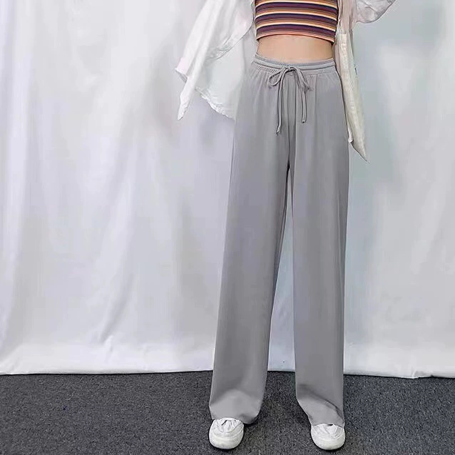 سروال الصيف الحرير الجليدي عريض الساق للنساء مع ارتفاع الخصر المتدل