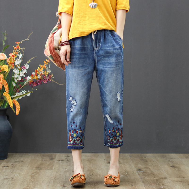 جينز نسائي للربيع والصيف جديد غير رسمي بخصر مطاطي مطرز من قماش الدنيم سراويلي حريمي بفتحات مغسولة سراويل كابري للنساء