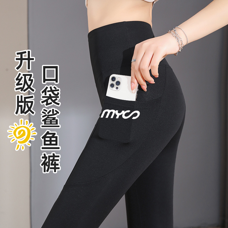 سروال ضيق من جلد القرش بجيب للنساء للربيع والصيف جديد عالي الخصر لتخسيس البطن بالإضافة إلى سراويل يوجا باربي للنساء