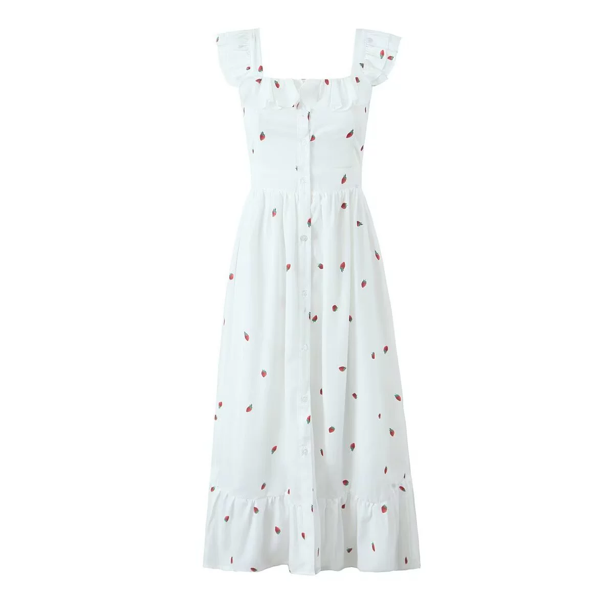 فستان نسائي جديد بحمالات بأزرار وطبعة فراولة
