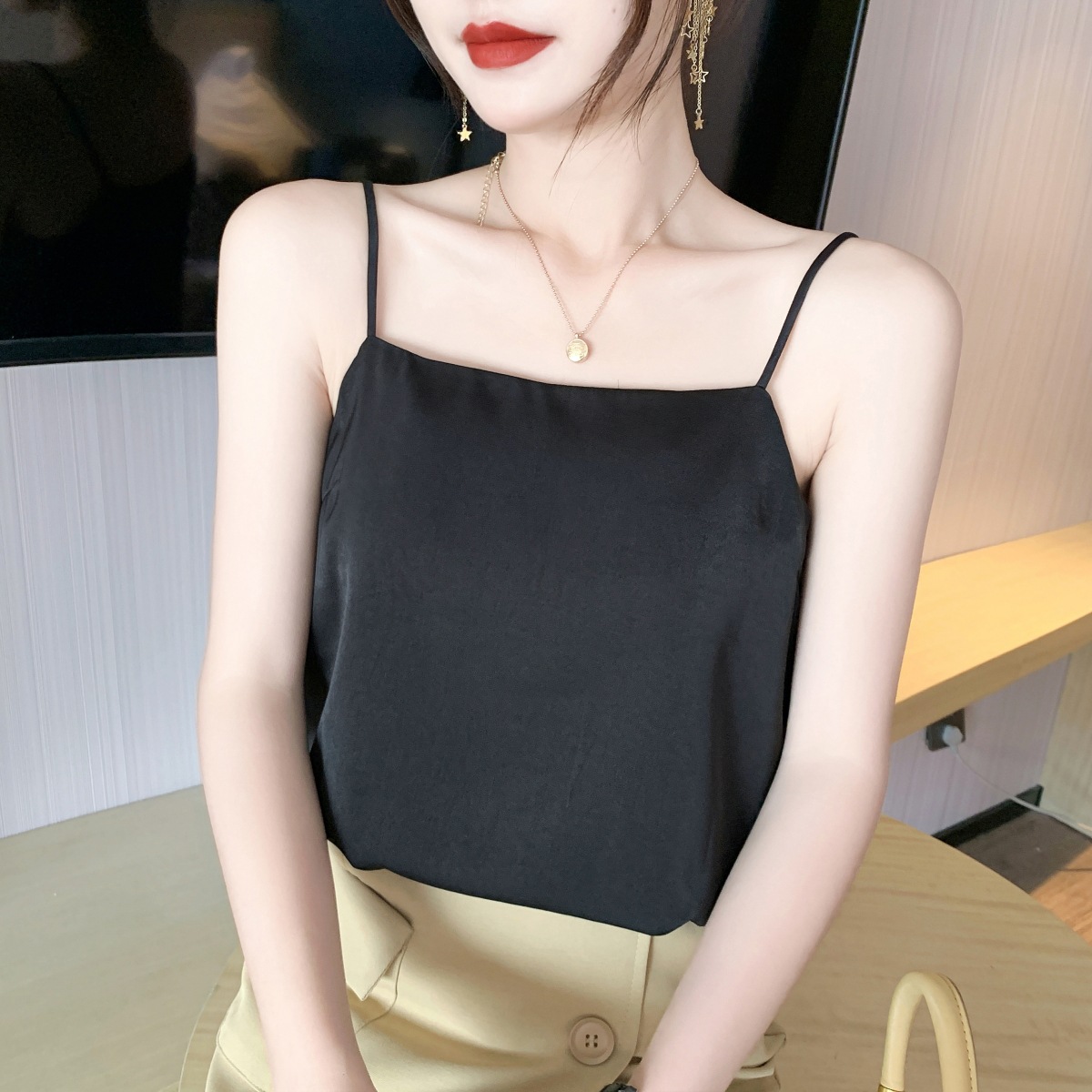 سترة حبال من الحرير الجليدي مع وسادة صدر ثابتة سفلية علوية مضادة للتعرض للسيدات صيفية جديدة بدون خياطة كوب سميك للظهر