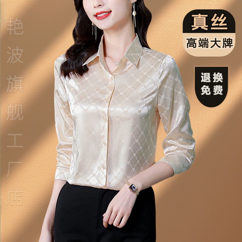 قميص حريري ثقيل أنيق نسائي بأكمام طويلة 2024 قميص أنيق على الموضة جديد الراقية بمعنى طعم العلامة التجارية الكبيرة