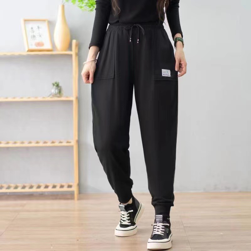 2024 الربيع والخريف حجم كبير سراويل تقليدية نسائية تغطي اللحوم وتبدو رقيقة وخفيفة الجانب الشق السراويل السوداء الصغيرة على شكل الكمثرى السراويل النساء