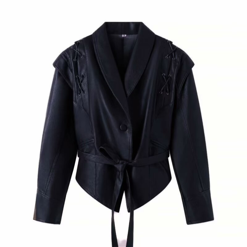 ملابس نسائية أوروبية وأمريكية عبر الحدود 2024 خريف جديد بياقة شيري عتيقة مع حزام سترة جلدية PU 6NS049