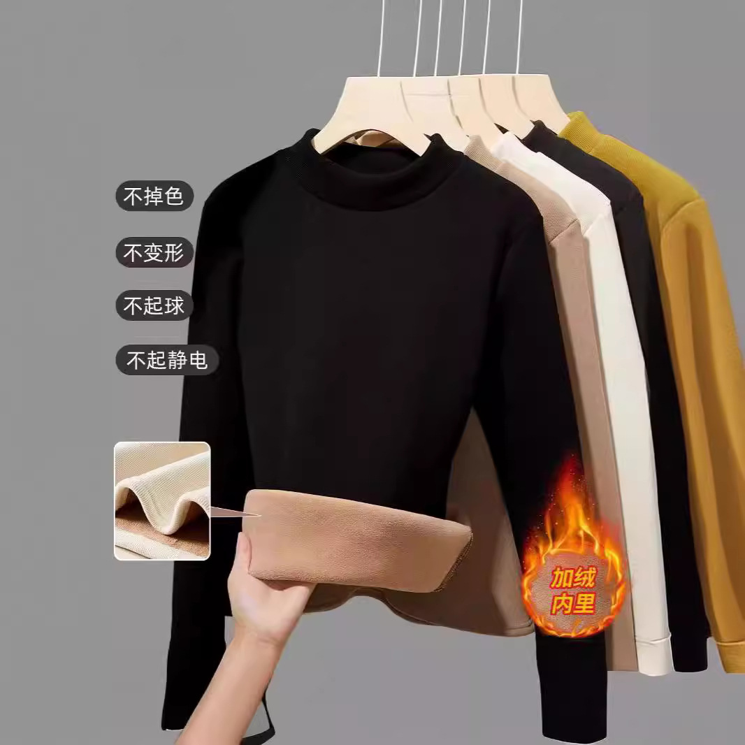 قميص نسائي سميك مبطن بالصوف للشتاء الدافئ ذو ياقة متوسطة وياقة متوسطة قميص نسائي داخلي بقصة ضيقة وياقة نصف عالية وأكمام طويلة