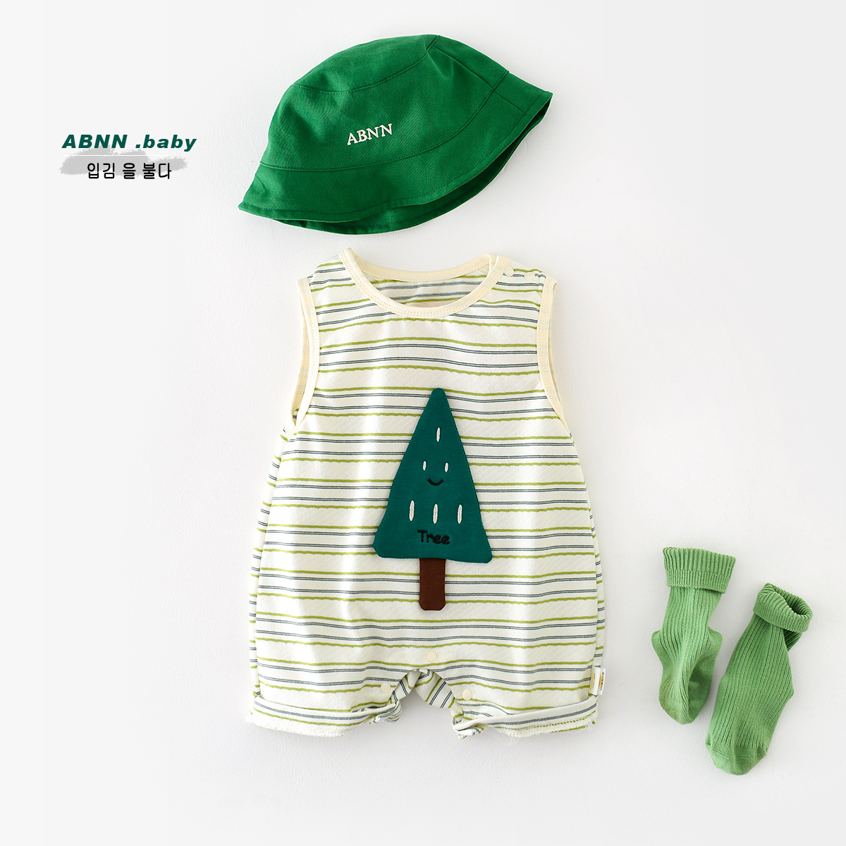 بذلة أطفال صيفية للرجال والنساء ملابس كورية مخططة باللون الأخضر على شكل شجرة صغيرة ملابس رائعة لحديثي الولادة بدون أكمام