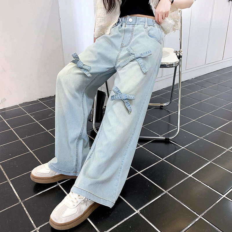 جينز بناتي صيفي رقيق 2024 سروال بناتي جديد بأرجل واسعة سروال أطفال صيفي مستقيم عصري