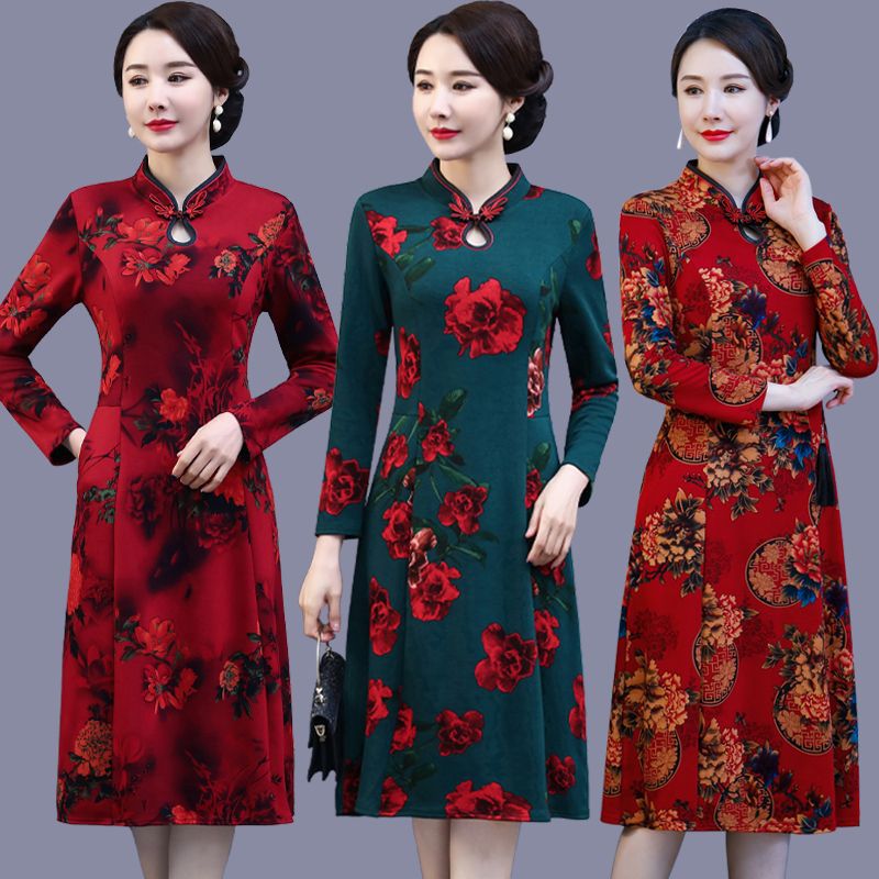 فستان شيونغسام للأم بأكمام طويلة مقاس كبير للخريف جديد مطبوع طويل محسن في منتصف العمر وكبار السن فستان التخسيس