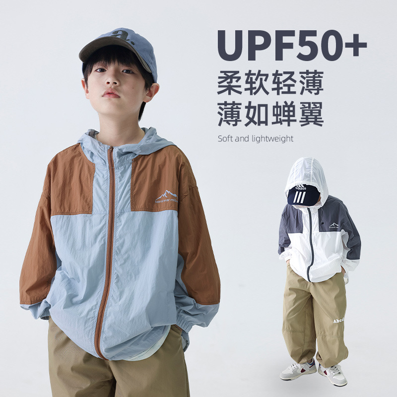 ملابس واقية من الشمس للأطفال جديدة لعام 2024 معطف صيفي رقيق Upf50 لون مقسم للأولاد ملابس واقية من الشمس ملابس جلدية