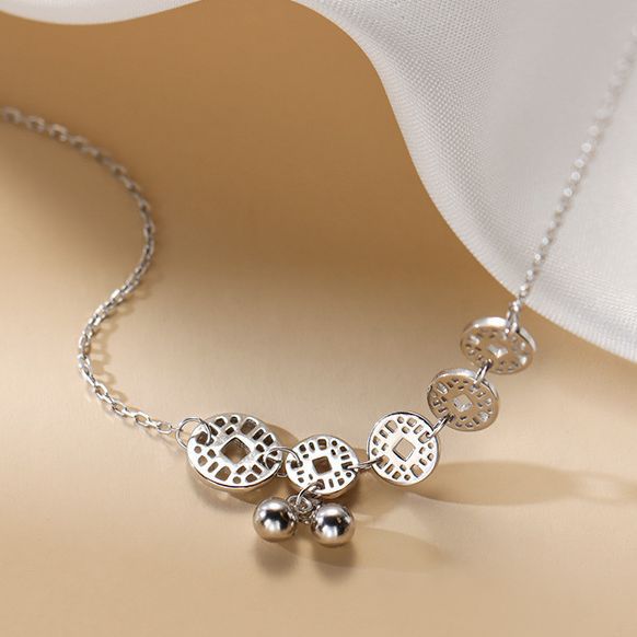خلخال على شكل عملة نحاسية من الخرز المربع المستدير للسيدات S925 من الفضة الإسترليني على الطراز القديم مجوهرات للقدم عالية الجودة ذات حس المال المحظوظ