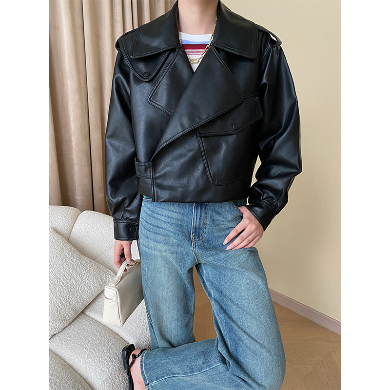 Sinan نمط دراجة نارية الشارع المألوف عالية الجودة طية صدر السترة الكبيرة فضفاضة معطف جلد غير رسمي SN4428