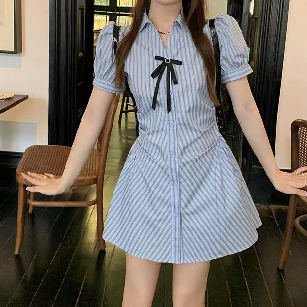بدلة على الطراز الكوري على الطراز الأكاديمي قميص أزرق مخطط فستان تنورة الخصر شورت غير رسمي مقاس كبير طقم مكون من قطعتين للصيف