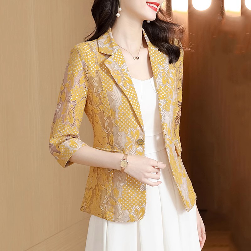 سترة بدلة صغيرة من الدانتيل الأصفر للسيدات صيفية رقيقة ومزاج عصري صغير بأكمام ثلاثة أرباع مجوفة