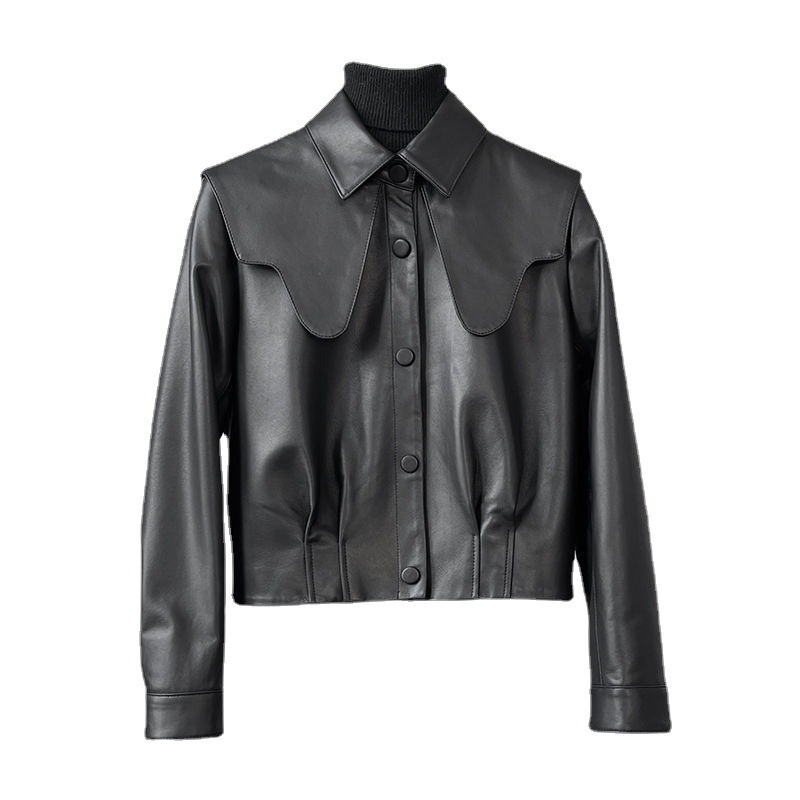 معطف جلدي قصير جديد لخريف المرأة بياقة بحرية عالية الخصر من جلد الغنم
