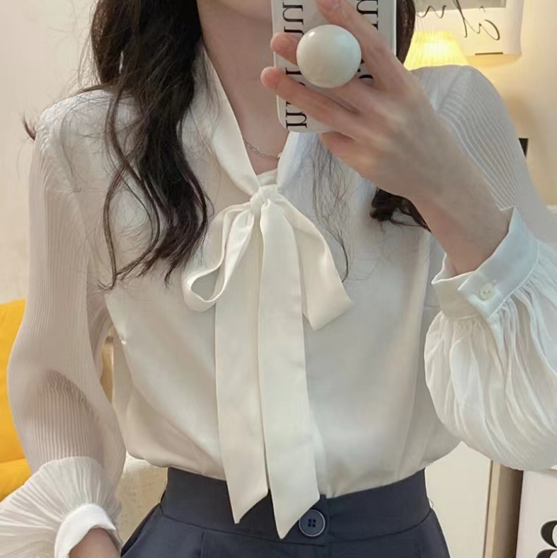 ملابس عمل بفيونكة قميص أبيض نسائي لخريف 2023 جديد بأكمام طويلة شيفون على الطراز الغربي فضفاض
