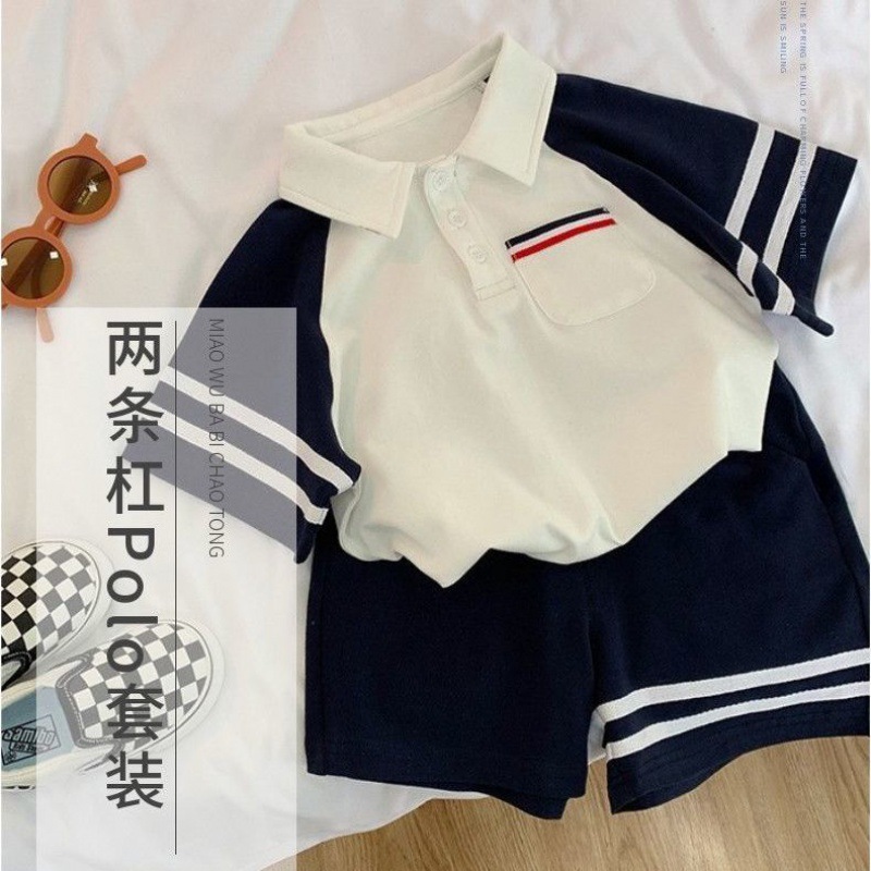 بدلة بولو صيفية للأطفال مخططة من قطعتين بأكمام قصيرة، بدلة أطفال أنيقة في منتصف العمر عصرية وسيم