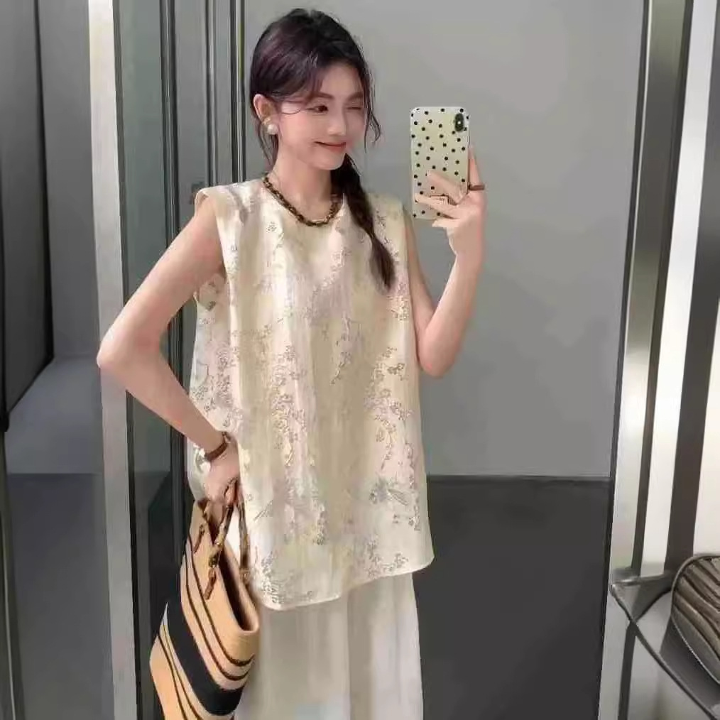 الصيف على الجديد! قميص LINIAN جديد وأنيق من قماش الجاكار فضفاض بدون أكمام ومطرز بشكل إيجابي وعكسي مجوف بصدر واحد