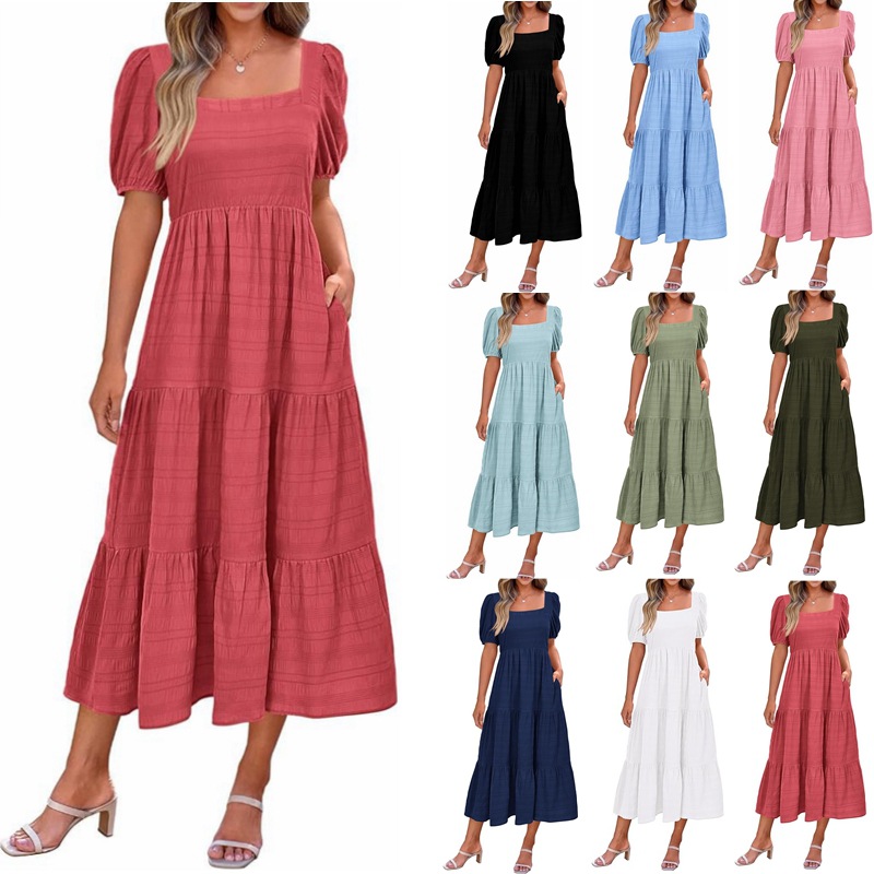 2024 التجارة الخارجية الأوروبية والأمريكية عبر الحدود الملابس النسائية الأمازون نفخة الأكمام ساحة الرقبة الظهر مطوي قصيرة الأكمام جيب اللباس