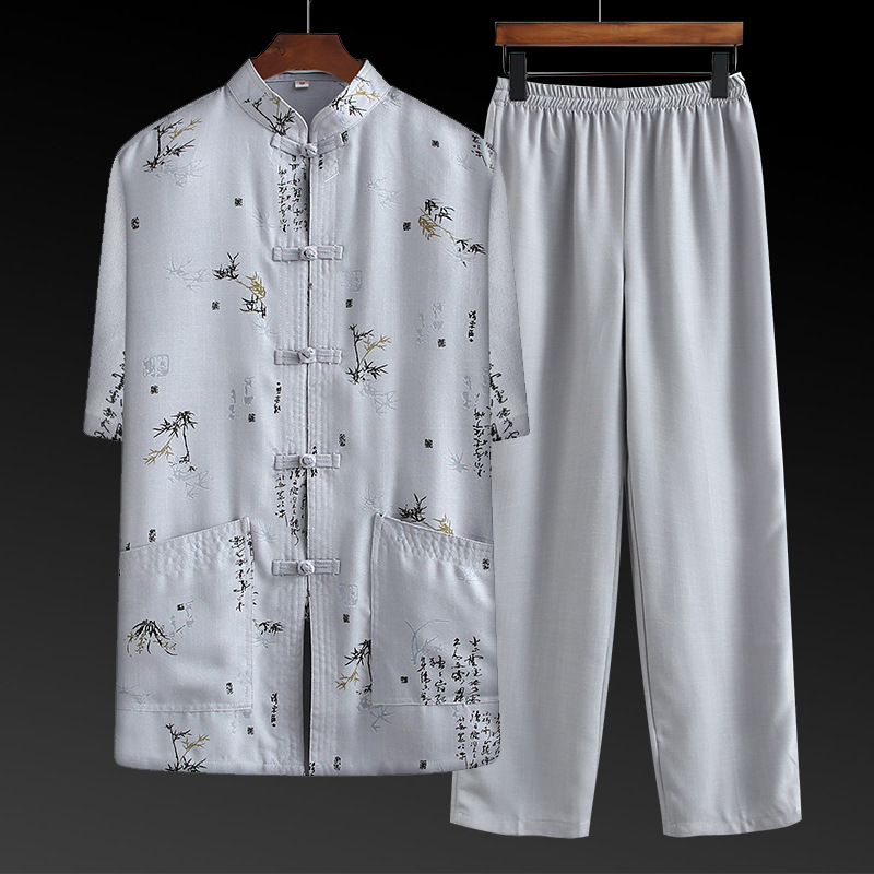 فستان كتان تانغ للرجال في منتصف العمر وكبار السن بدلة صيفية للأب الجد القديم بأكمام قصيرة 60-70 سنة على الطراز الصيني ملابس من القطن والكتان