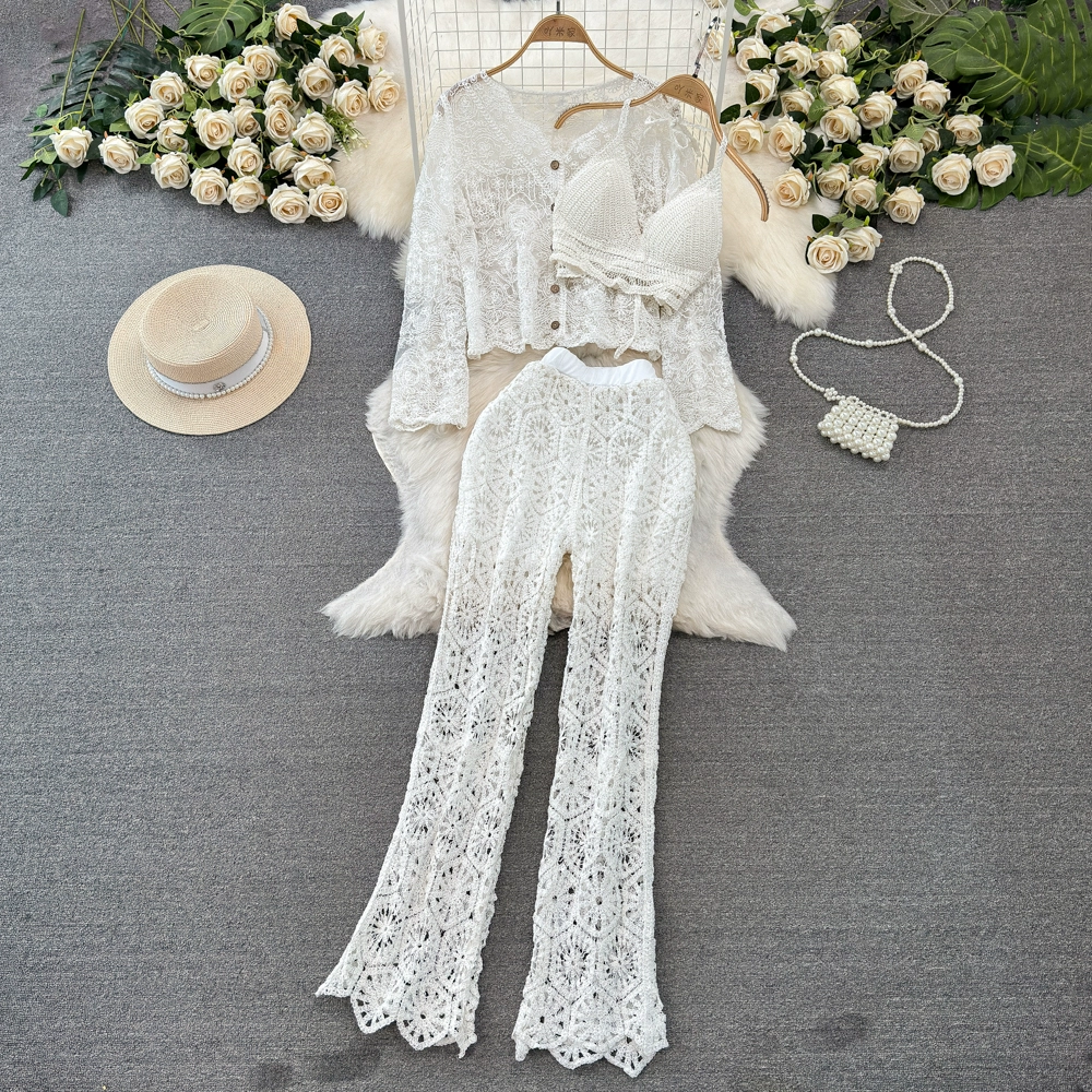 طقم أزياء، عطلة على شاطئ البحر، حمالة عنق، قميص قصير بدون ظهر، طقم من ثلاث قطع، سترة محبوكة مجوفة، سروال صغير عالي الخصر