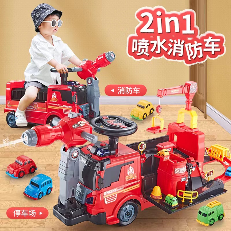 سيارة لعبة كبيرة الحجم للأطفال مع رذاذ الماء لمكافحة الحرائق بأربع عجلات سكوتر هندسي المسار 2 في 1 ديناصور للأولاد