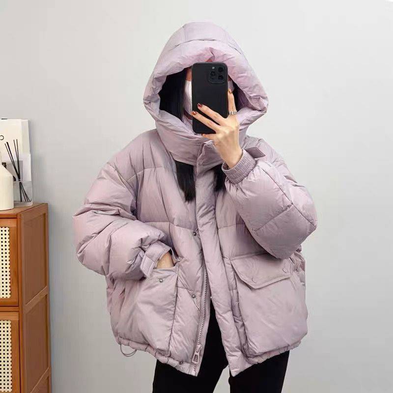 سترة شتوية جديدة لعام 2023 للنساء قصيرة بقلنسوة وسميكة على الطراز الكوري معطف فضفاض للتنحيف والخبز معطف أبيض للأسفل من البط