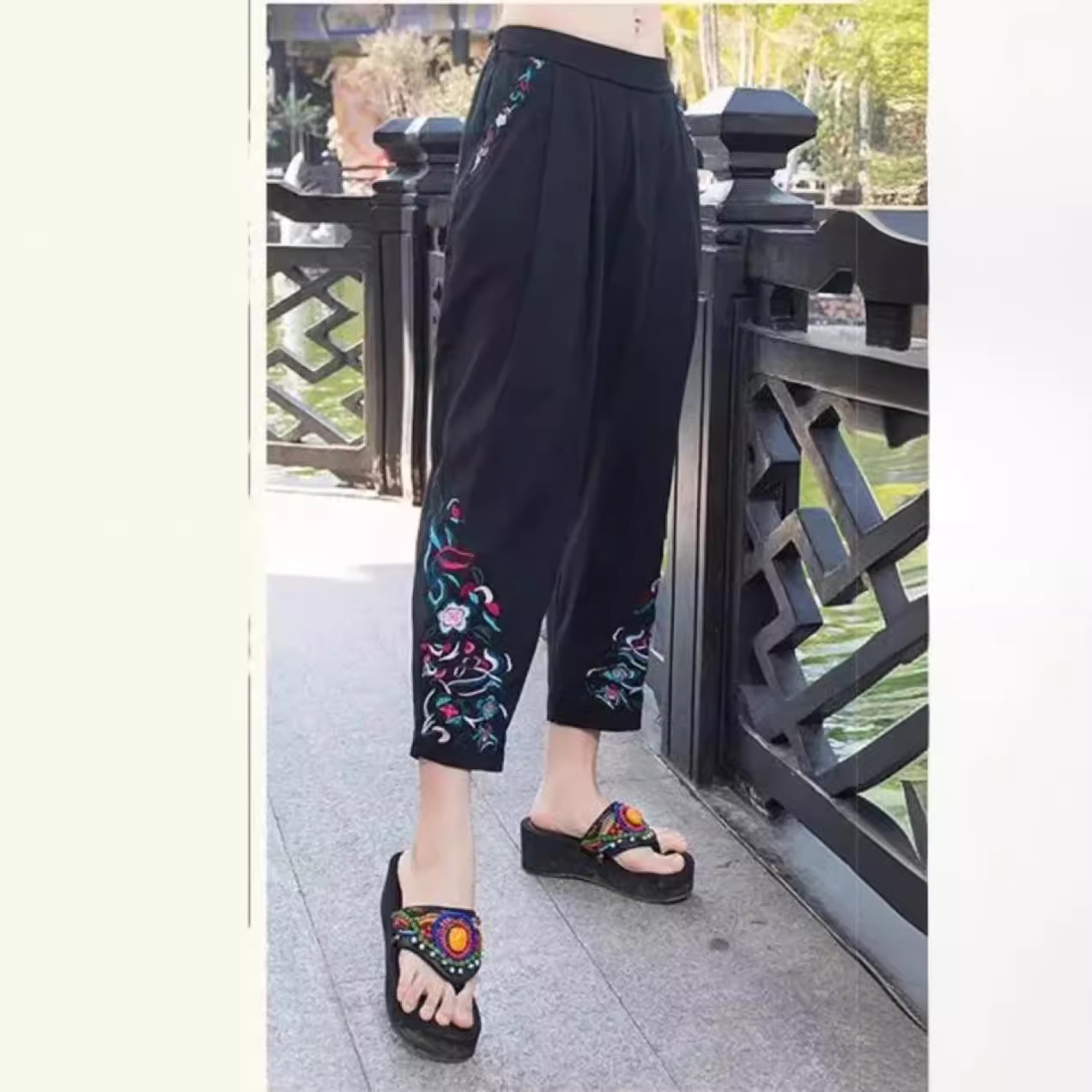 جمهورية الصين نمط خمر عادية الثقيلة المطرزة الكتان السراويل النسائية العرقية نمط مطرزة الكاحل طول السراويل