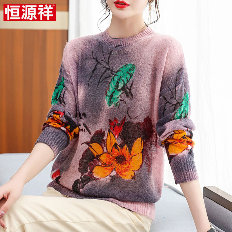 Hengyuanxiang سترة صوفية محبوكة جديدة للخريف للأمهات في منتصف العمر برقبة مستديرة فضفاضة للتخسيس وأكمام طويلة
