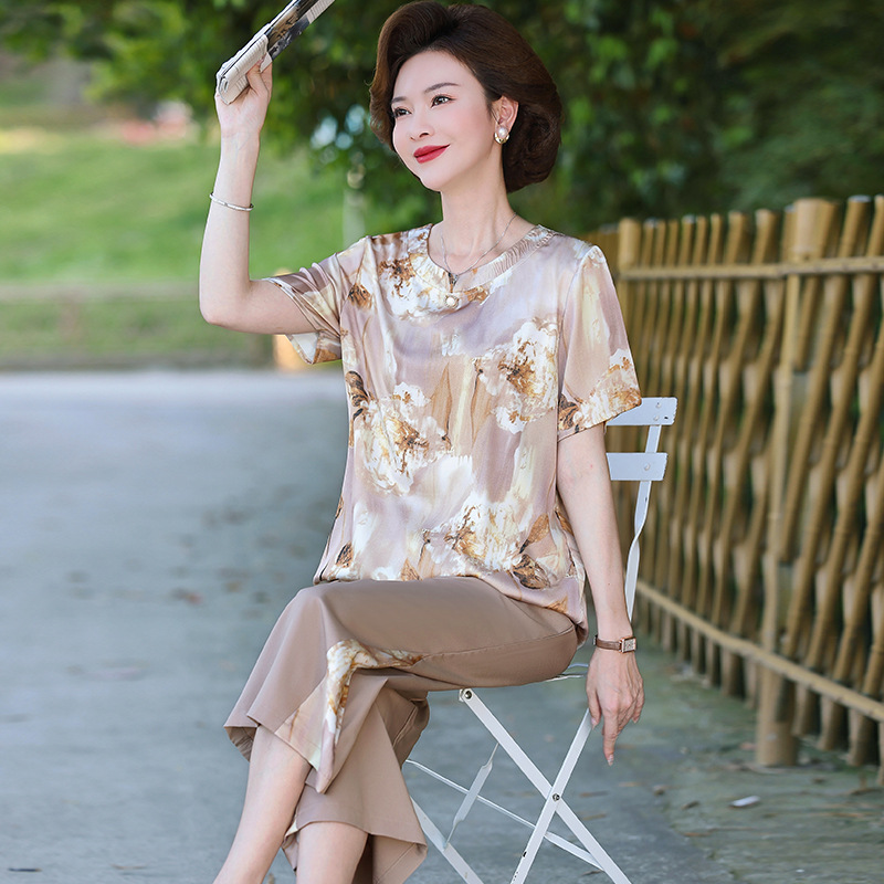 فستان صيفي للأم في منتصف العمر تي شيرت قصير من الحرير الجليدي على الطراز الغربي ورقبة دائرية وقميص صغير رفيع في منتصف العمر وكبار السن تي شيرت نسائي بأكمام قصيرة مقاس كبير