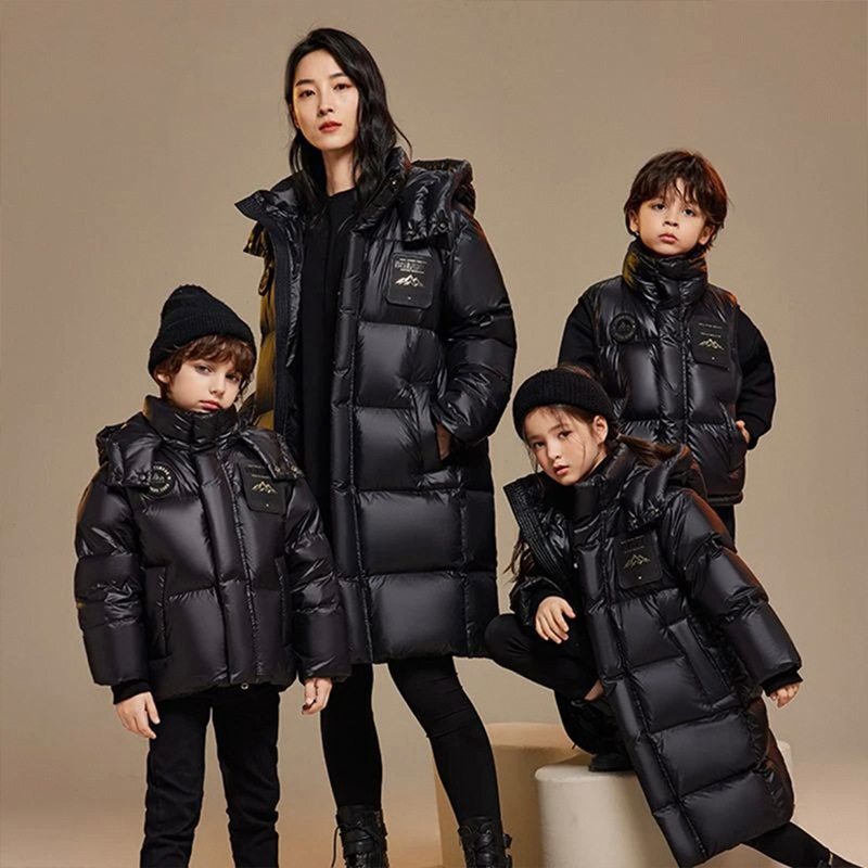 سترة للأطفال باللون الأسود والذهبي متوسطة الطول 2024 على الطراز الغربي الجديد للفتيات معطف شتوي متوسط وكبير للأطفال سميك للرجال معطف كبير للأطفال
