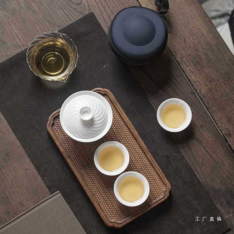 US4A كوب سيراميك سريع وعاء واحد ثلاثة أكواب محمولة للسفر في الهواء الطلق طقم شاي بدلة محمولة للتخييم على الطراز الصيني غطاء وعاء