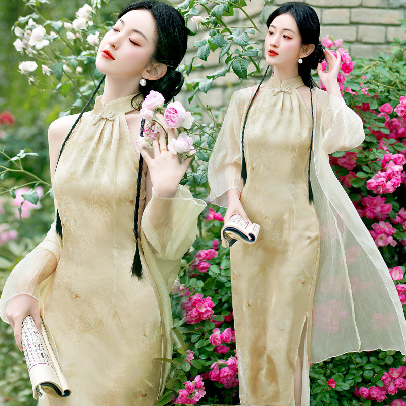لقطة حقيقية جديدة الصينية المطبوعة شيونغسام معلقة الرقبة أكمام الكتف مشبك النمط الوطني زن معطف على شكل ثوب المرأة قطعتين مجموعة