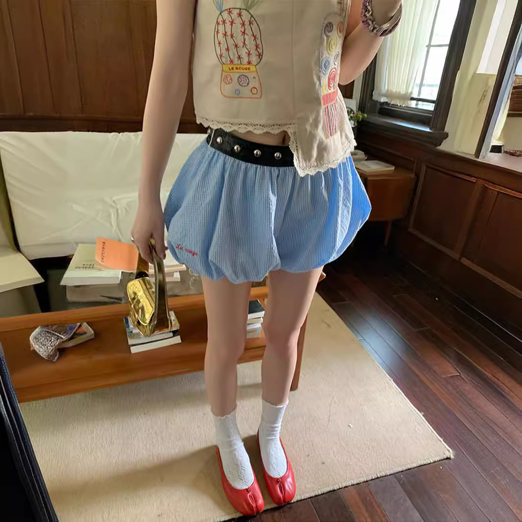 شورت صيفي من Le Rouge zhou Meimei باللونين الأزرق والأبيض منقوش بحزام مشمش منتفخ ومطرز برعم الزهرة