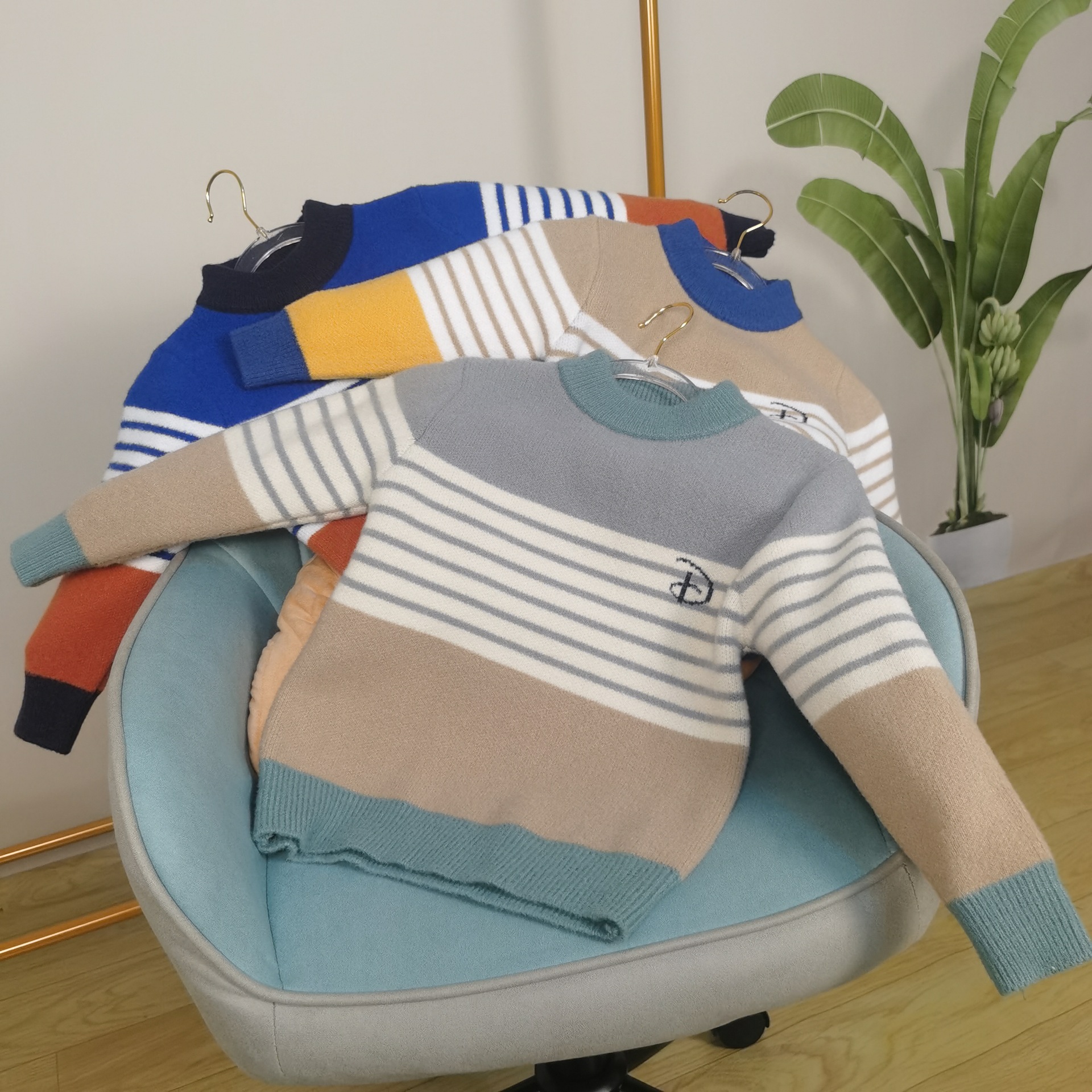 2023 جديد الخريف والشتاء K المخملية الرقبة المستديرة الأطفال محبوك سترة مخططة لينة الفتيات الفتيان البلوز قاع قميص