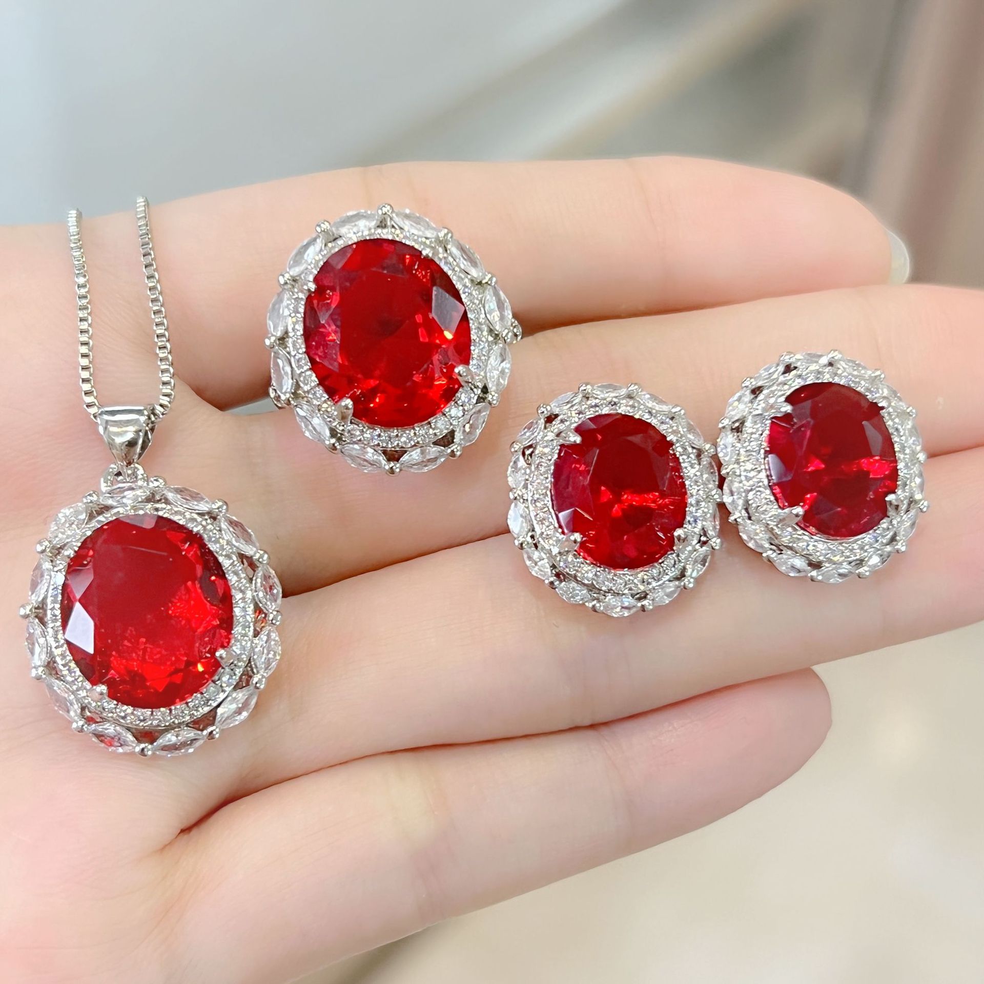 Tiktok لايف رائجة البيع أحمر أخضر أزرق اللون الكنز حمامة البيض خاتم الماس وأقراط قلادة مجوهرات دعوى الحصان العين الزركونيوم مجوهرات