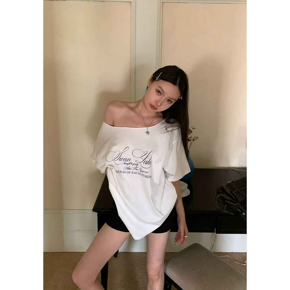 تيشيرت صيفي فضفاض مطبوع بدون أكتاف وأكمام قصيرة