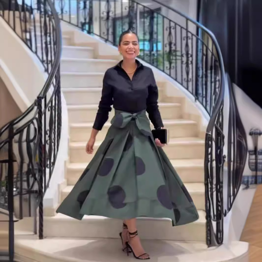 أمازون 2024 بدلة نسائية صيفية أوروبية وأمريكية جديدة بأكمام طويلة وتنورة منقطة مطبوعة