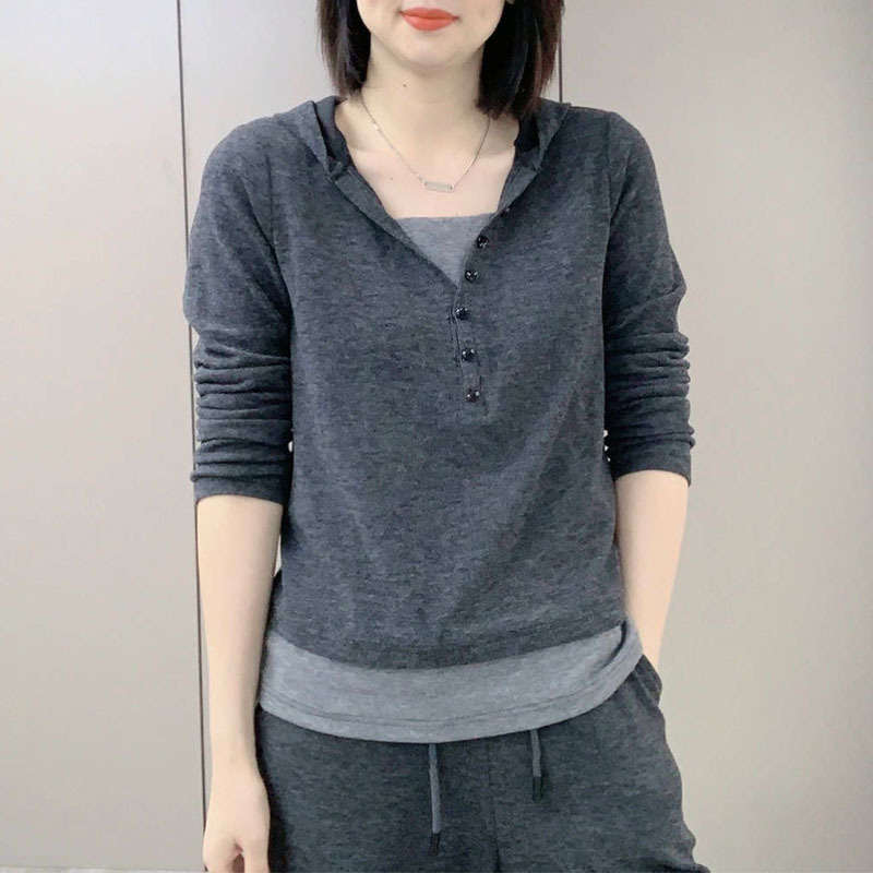 سويت شيرت نسائي بقلنسوة لربيع وخريف 2024 مصنوع من الصوف السميك على الطراز الكوري وخياطة وهمية من قطعتين عصرية تناسب كل مباراة التخسيس