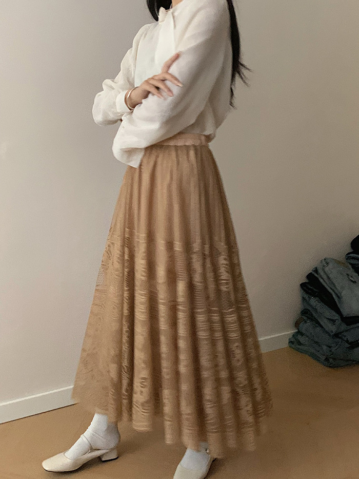 تنورة على الطراز الكوري بخصر مطاطي من الدانتيل الشبكي تنورة عالية الخصر للنساء 24 ربيع نحيف للتنحيف على شكل حرف A