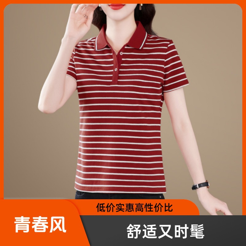 أمي قميص بولو تي شيرت المرأة الصيف جديد مخطط التلبيب قصيرة الأكمام حجم كبير الترفيه الرياضية بياقة المرأة أعلى 5