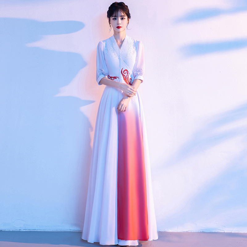 فستان طويل للسيدات على الطراز الصيني، تنورة متغيرة الألوان، زي كورس للغناء باللون الأحمر، فستان المنافسة للسيدات