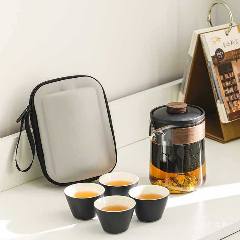 US4A طقم شاي السفر الزجاجي المحمول كوب سيراميك سريع وعاء واحد أربعة أكواب طقم شاي التخييم يناسب تخصيص الأعمال