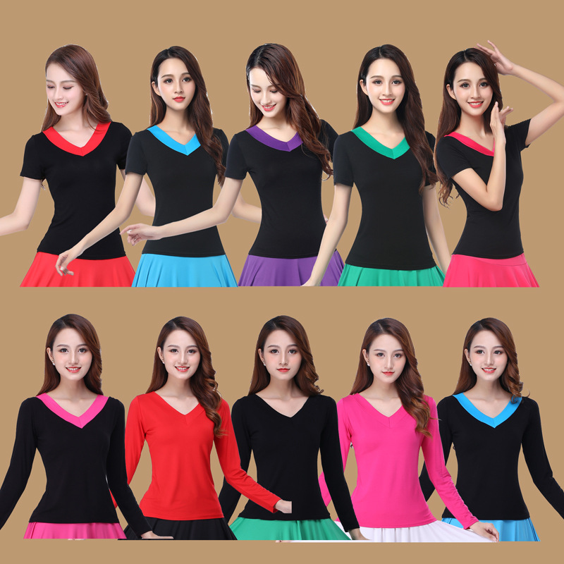 الصيف نمط جديد ساحة الرقص زي أعلى قصيرة الأكمام طويلة الأكمام منتصف العمر وكبار السن تي شيرت برقبة على شكل v الجبهة الخامس الخلفي جولة الرقبة ملابس رقص