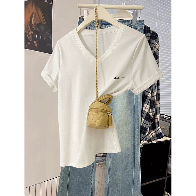 تي شيرت نسائي من القطن الخالص مقاس كبير من Fat mm تي شيرت أمريكي بأكمام قصيرة للنساء 2024 تصميم جديد برقبة على شكل حرف v للتنحيف فضفاض للنساء