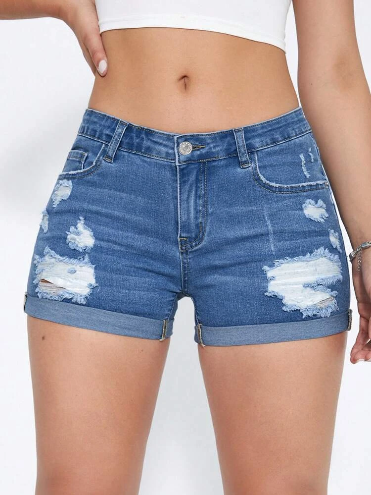 شورت جينز بحافة مطوية وتفاصيل مزركشة.
