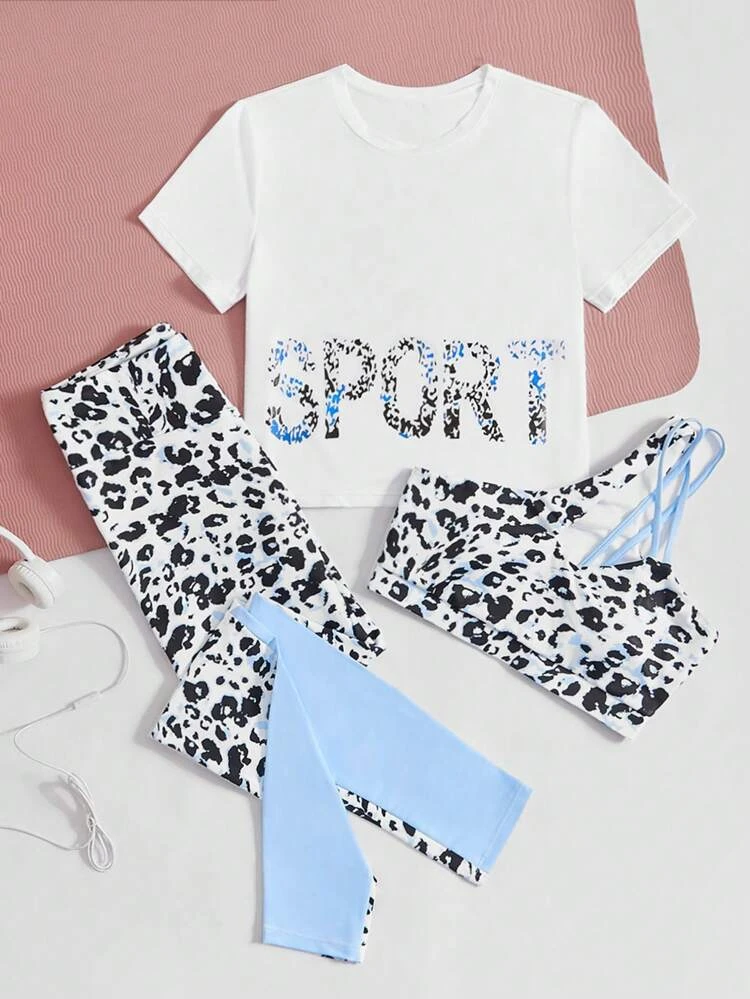طقم تي شيرت برسومات وبنطال ضيق بنقشة جلد الفهد وحمالة صدر.